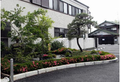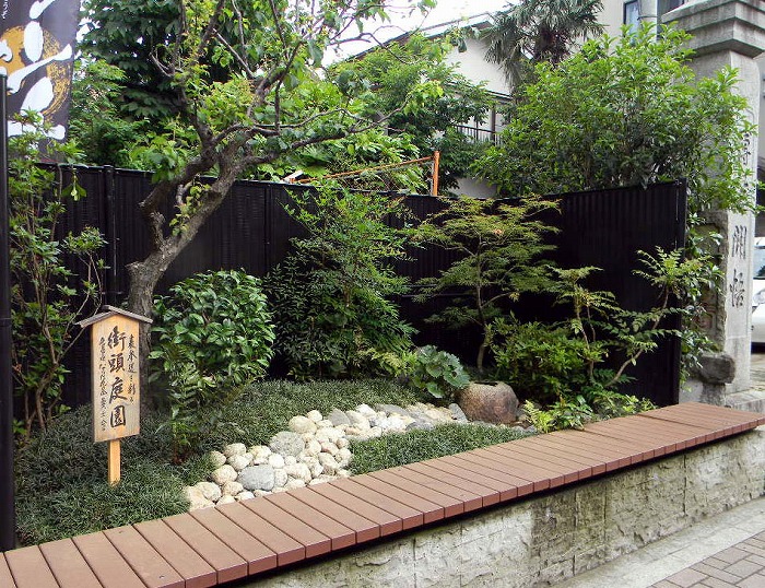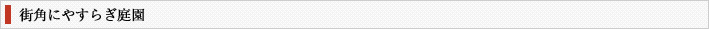 道路脇に歩いている人が憩いの休憩の場所。樹木の手入は、自然らしく、庭園は少さいが安 らぎの庭として、構成した。