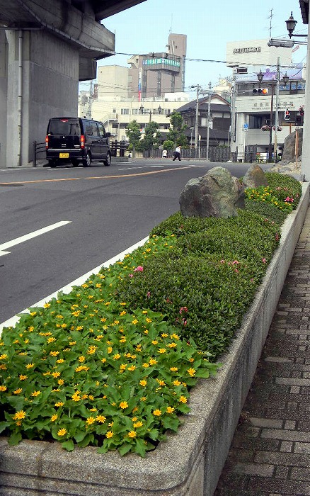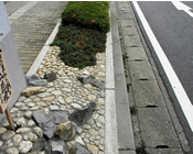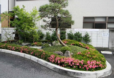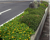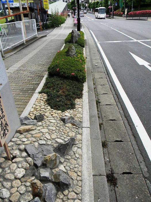 道路脇に造られたグリ-ンベルトにサツキ、玉龍、石、花による見通のよい、低木を使用す ることにより周囲の安全を図る。(左側2点)