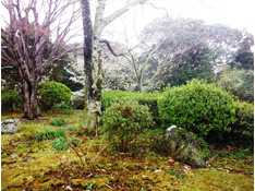 | 左側より | 茶室の玄関より入口の門を見ている 床は石張りによって、玄関と入口に対して空間を損なわないように している。 園路、左右は「立寒椿」により「芝生垣根」とし園路は、無駄なく空間を利用している中で右側、上部には紅葉、コナラなどの雑木の枝を植込み枝の流れれで、柔らかな雰囲気をかもしだし作庭を行った。 |