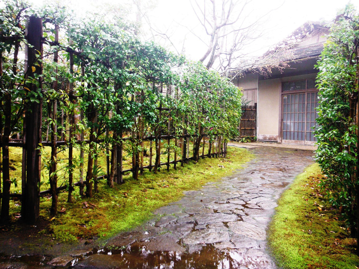 | 正門から茶室を見た姿。園路・石張りの側が苔によって落ち着きのある庭園空間となっている。 |