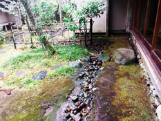 | 広間脇に造られた立手水鉢、下草と雨落の姿が庭としての柔らかさが常に見入られる。 |