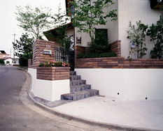 | 右側 | 玄関通路、左側に植裁をし、木曽石で庭に対し、高さを造る事により変化をあたえる通路は、御影石を配置しその曲がりを伊勢ゴロタ張り。正面に当たった場所も、主庭のつながりとして植え込みと なっている。 |