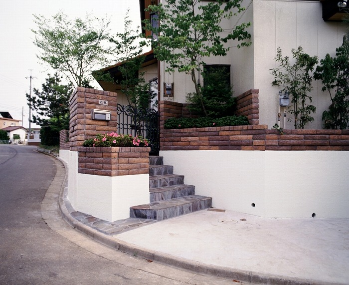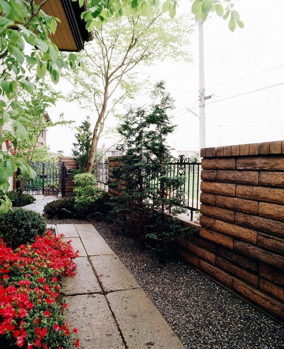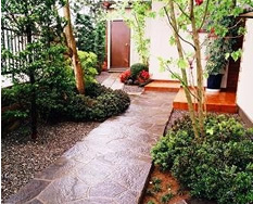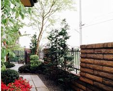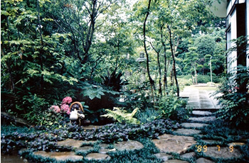 | 狭い庭の配置と空間。家の軒先に対しては、石張を作成し、樹木に対して、下枝をすることにより空間を図る。 |