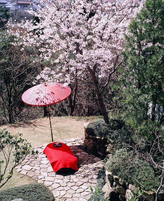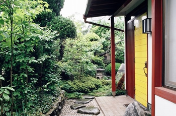| 玄関から右側を見た。正面に垂れ桜その下に灯篭、手水鉢などを据え付けている。 | |