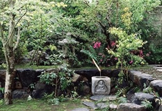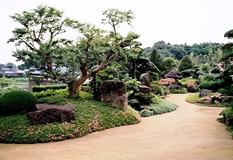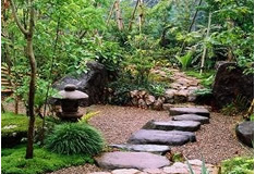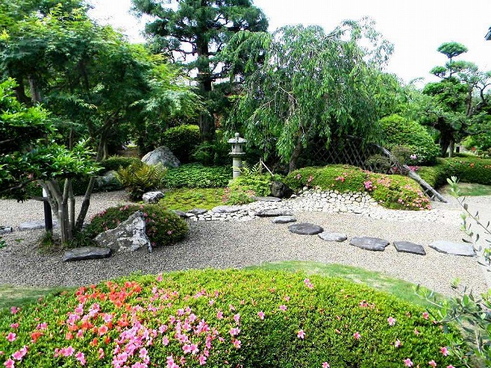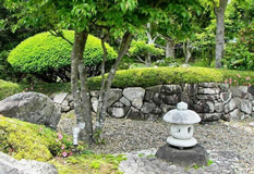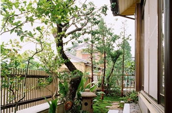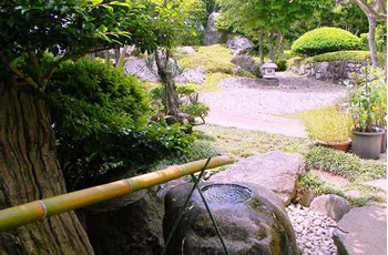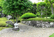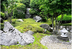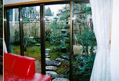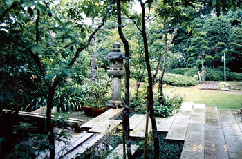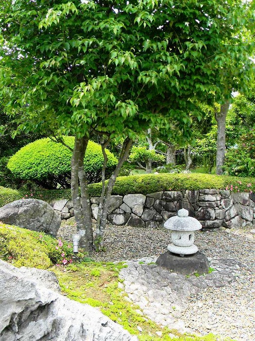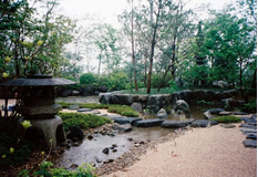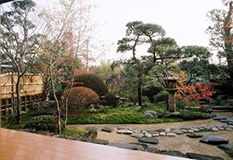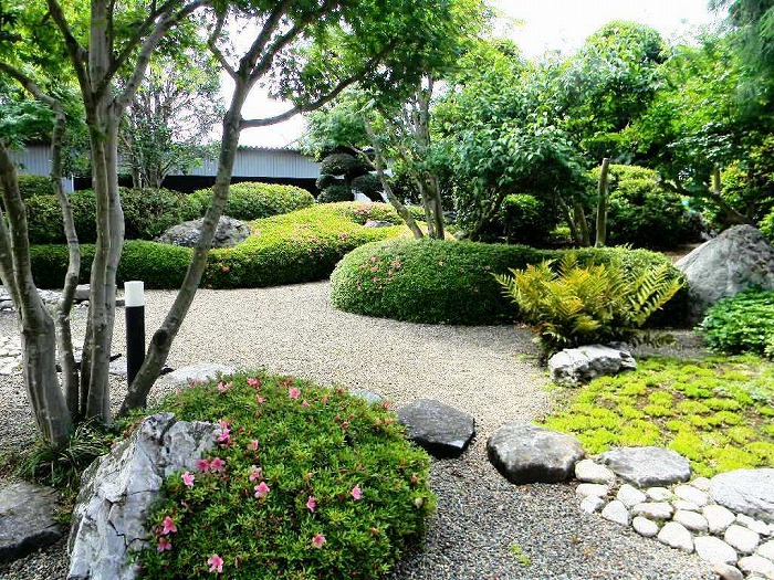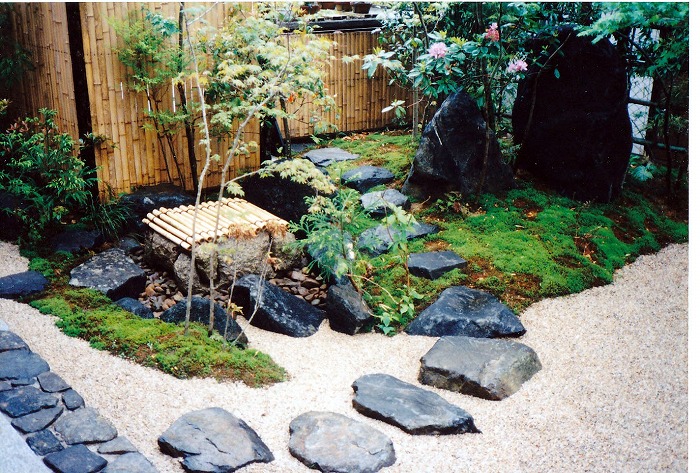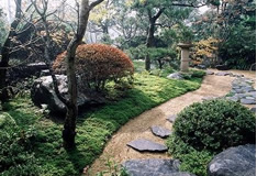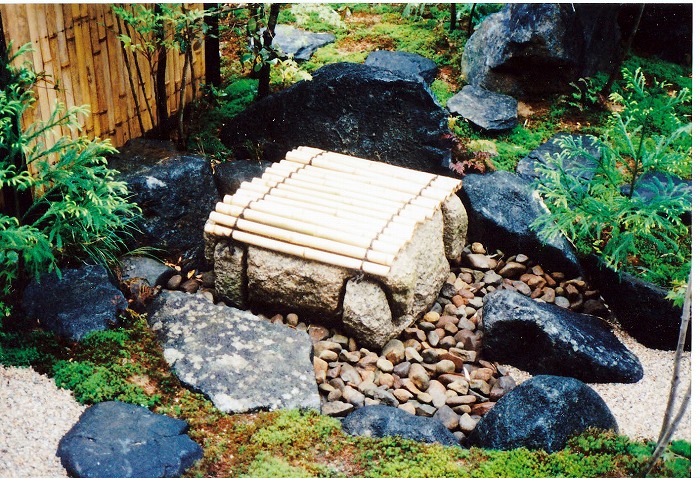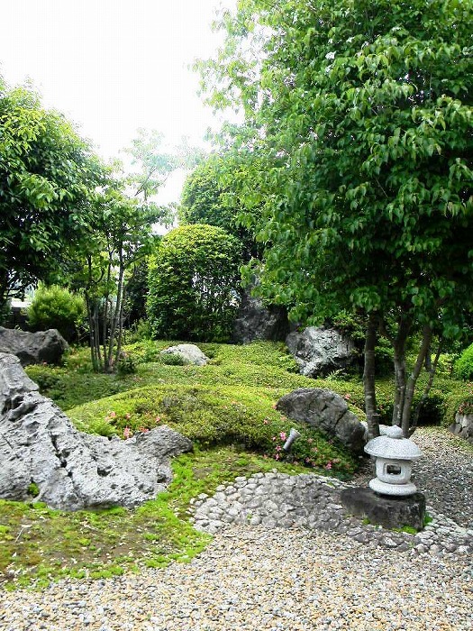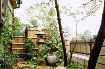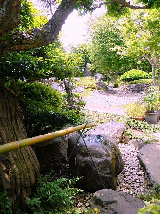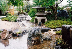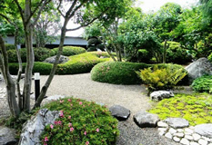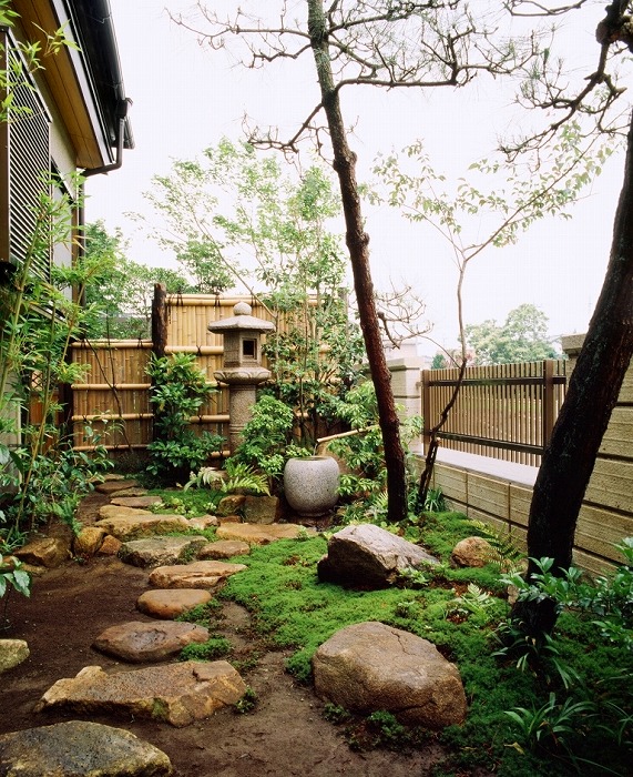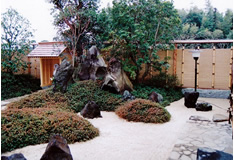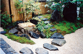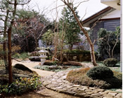| 奥は、小砂利を伊也砂利、灯篭、川流れ、飛石などを使用・植木・雑木を利用 。 | |