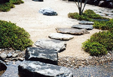 | 左側より | 川流れと枯山水をつなぐ飛石。飛石は、新筑波石を使用。 |