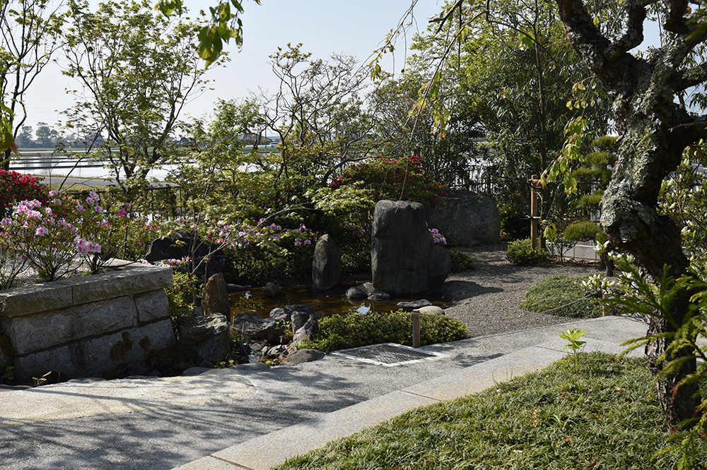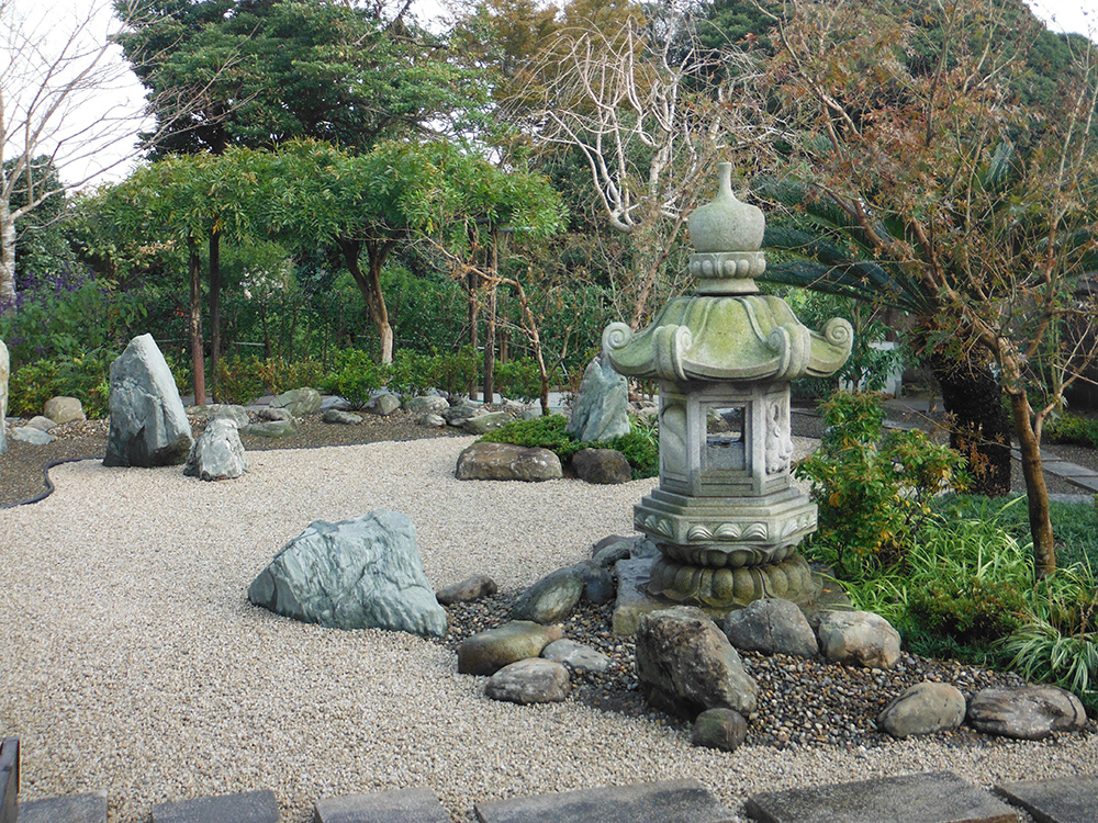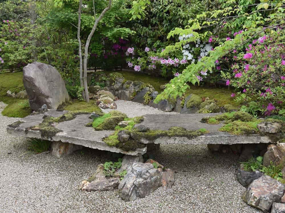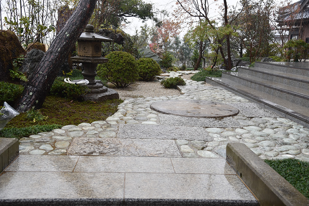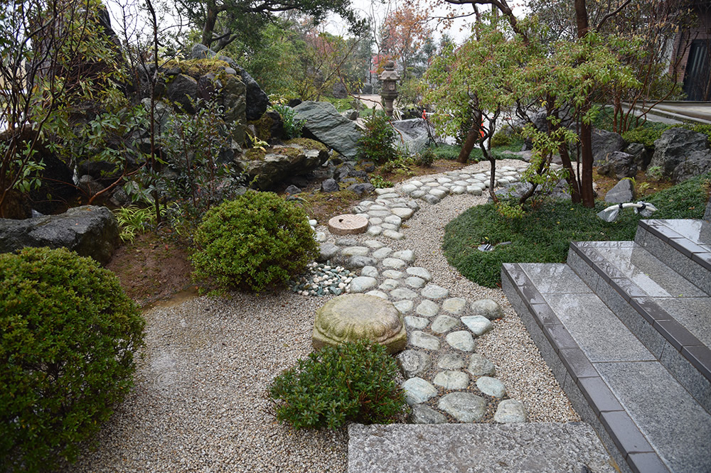 これにより、石の組み合わせ四方仏を取り入れ、下界より仏の世界を現す。玉石を組み、橋とし、園路平石張りの中に凹凸のある部分は、人生を歩む姿を取り入れた庭園。