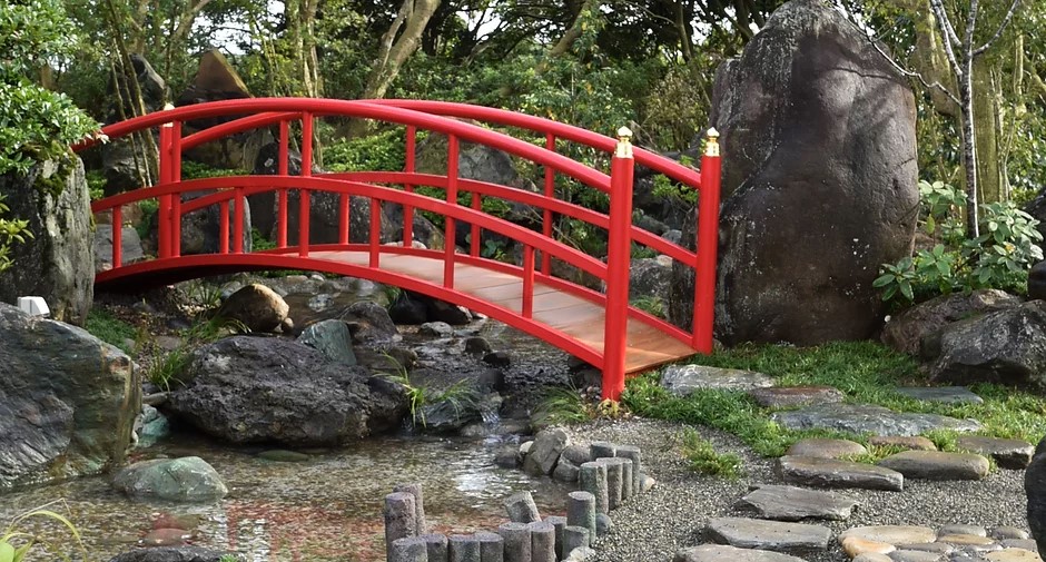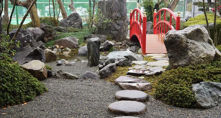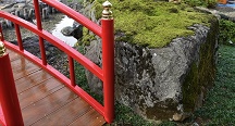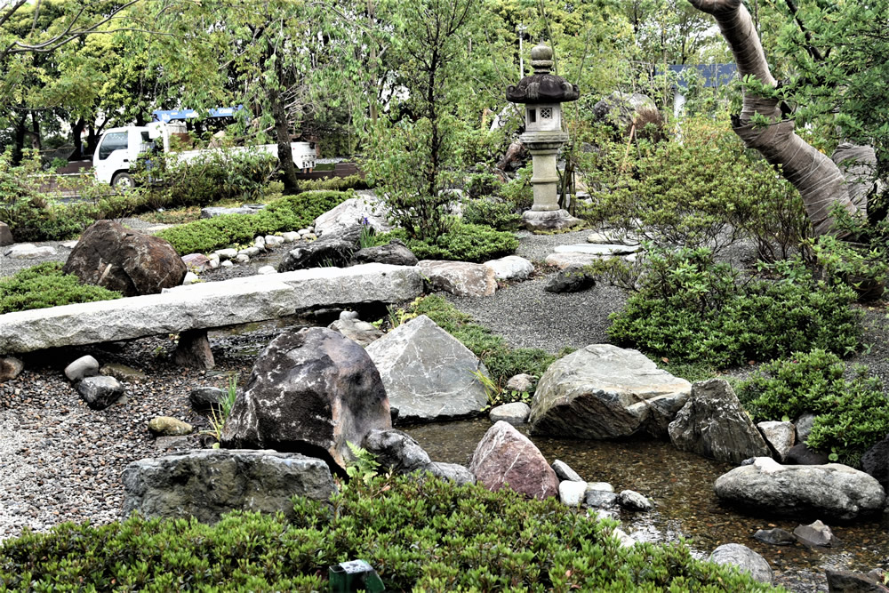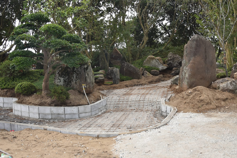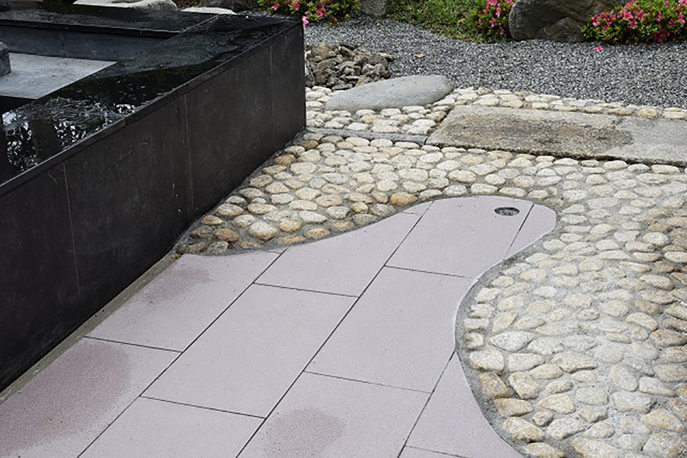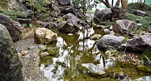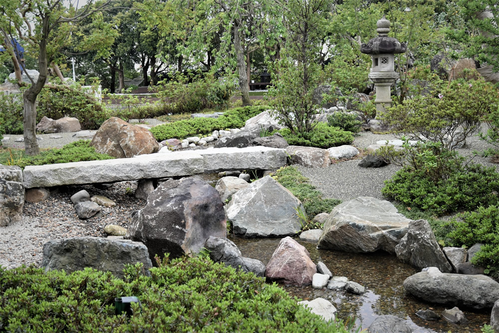 これにより、石の組み合わせ四方仏を取り入れ、下界より仏の世界を現す。玉石を組み、橋とし、園路平石張りの中に凹凸のある部分は、人生を歩む姿を取り入れた庭園。