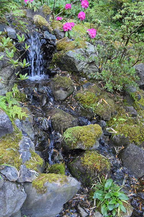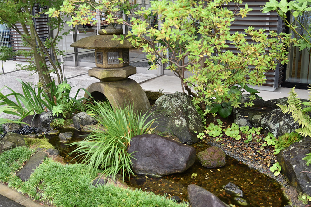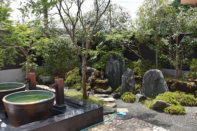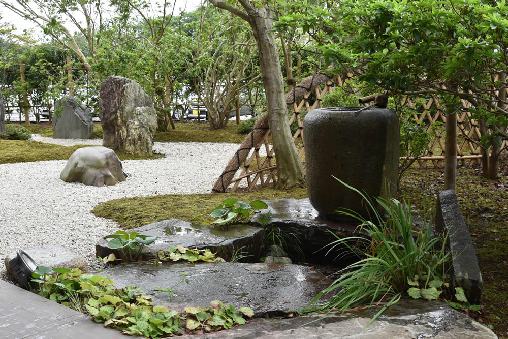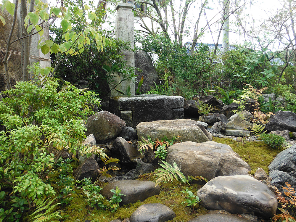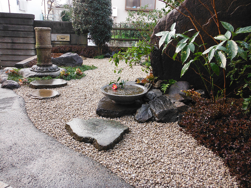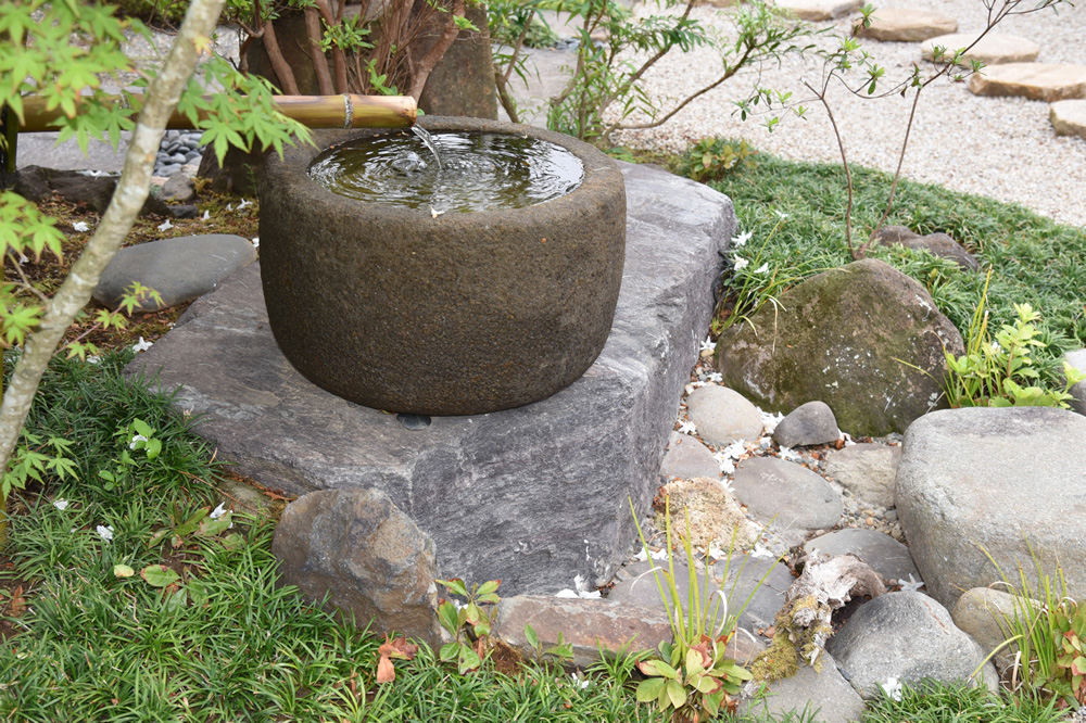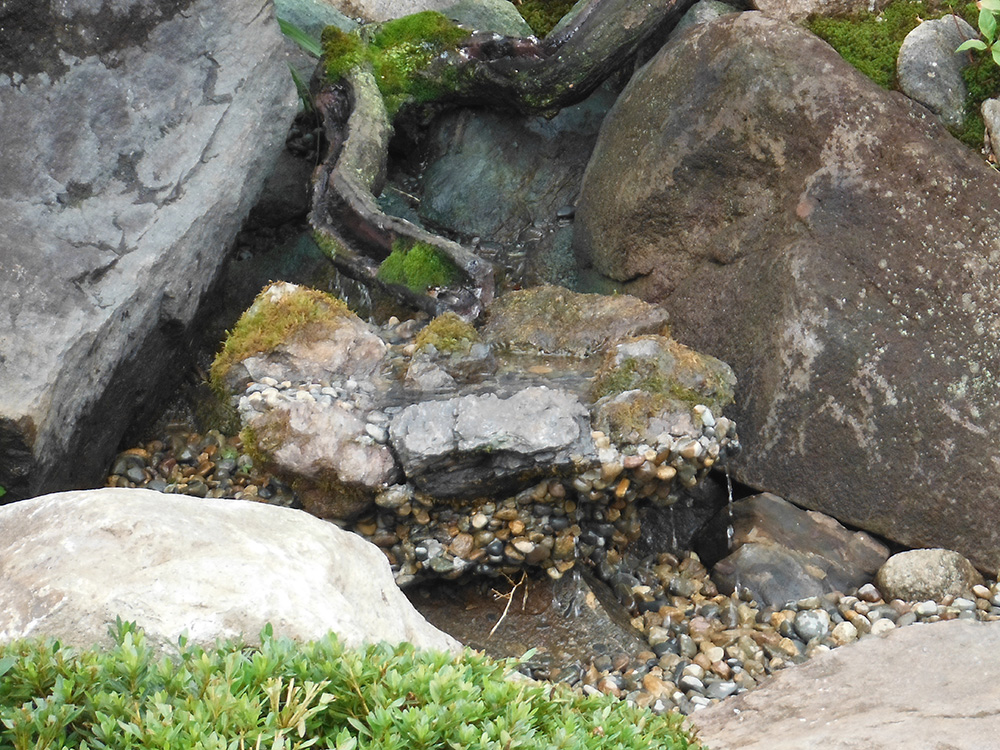 循環ポンプを取り入れて水を流し地被及び下草により流線、明暗など少々芸術的な美の世界をつくりました。