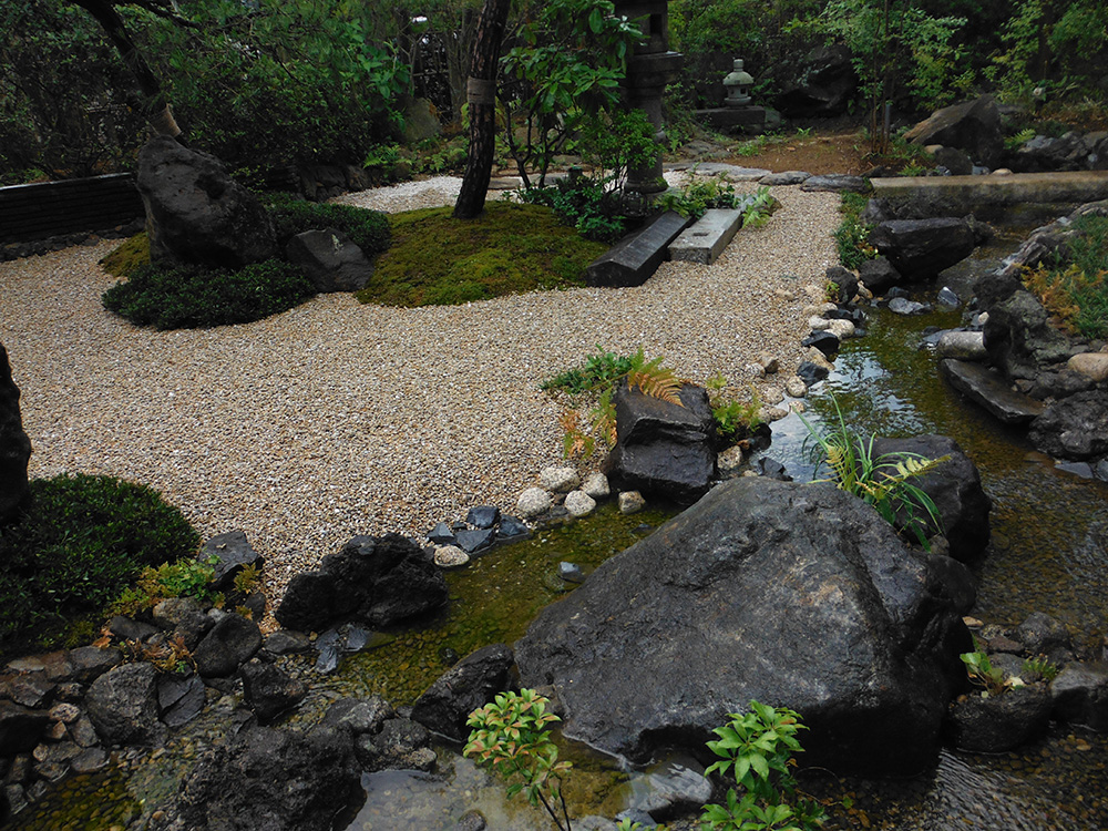 日本庭園の本来の姿。山部、水流、砂利浜により池の姿を表現いたしました。