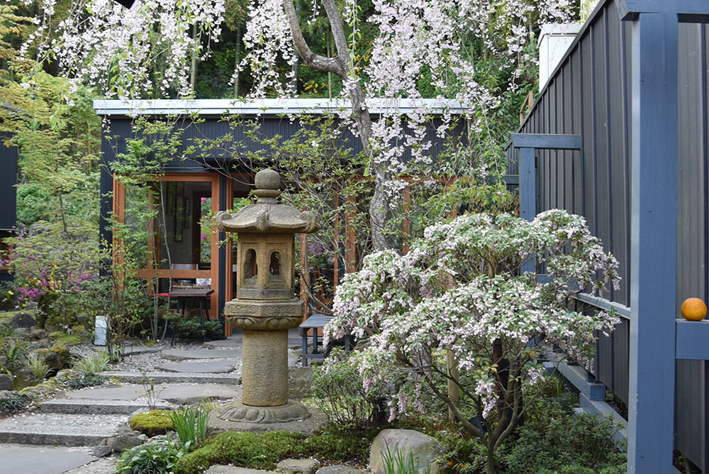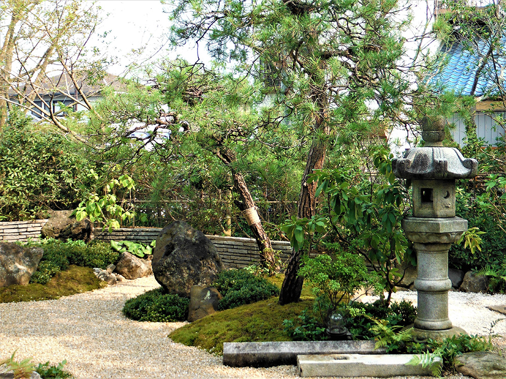 路地に入ると右に大明竹植え縁深い姿を表現し、主庭にはしだれ桜が植えてありましたので桜に対し、灯篭を置き、素傘などを組み合わせ庭の正面の姿を作り出しています。