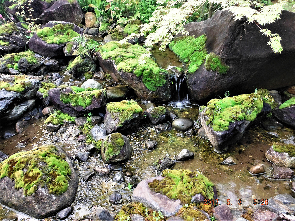 ホ-ルの窓より中心に置いてある外国より取り寄せたエキ玉を配置に対し「和風を取り入れた庭を造りたい」との依頼主要望です。よって、川の間に有る為、風が強いので垣根を造り壁面の上部に霧をタイマーにより発生させ空気中に水分を散布ことにより、湿度を保つ事、よって苔なども岩について和風の味をかもしだしています。
