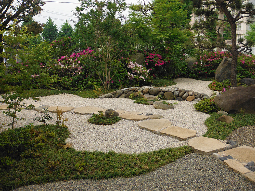 ⑦ 広い空間には、皐月、躑躅によっての刈込もようを造り間には、影石を配置し、小砂利によって静かな雰囲気をだしました。