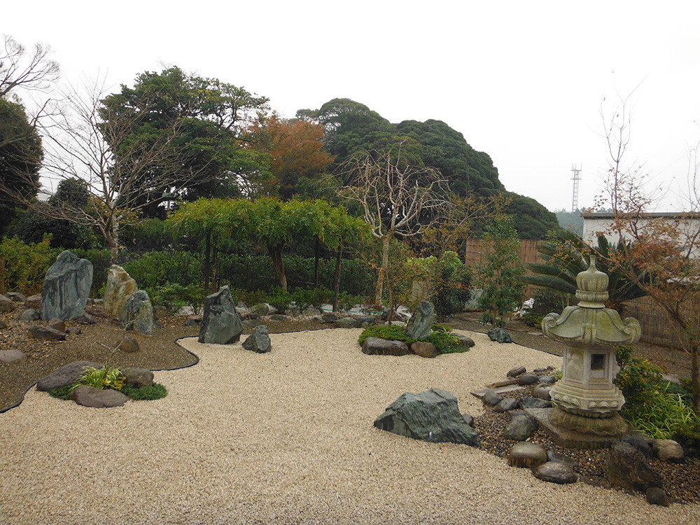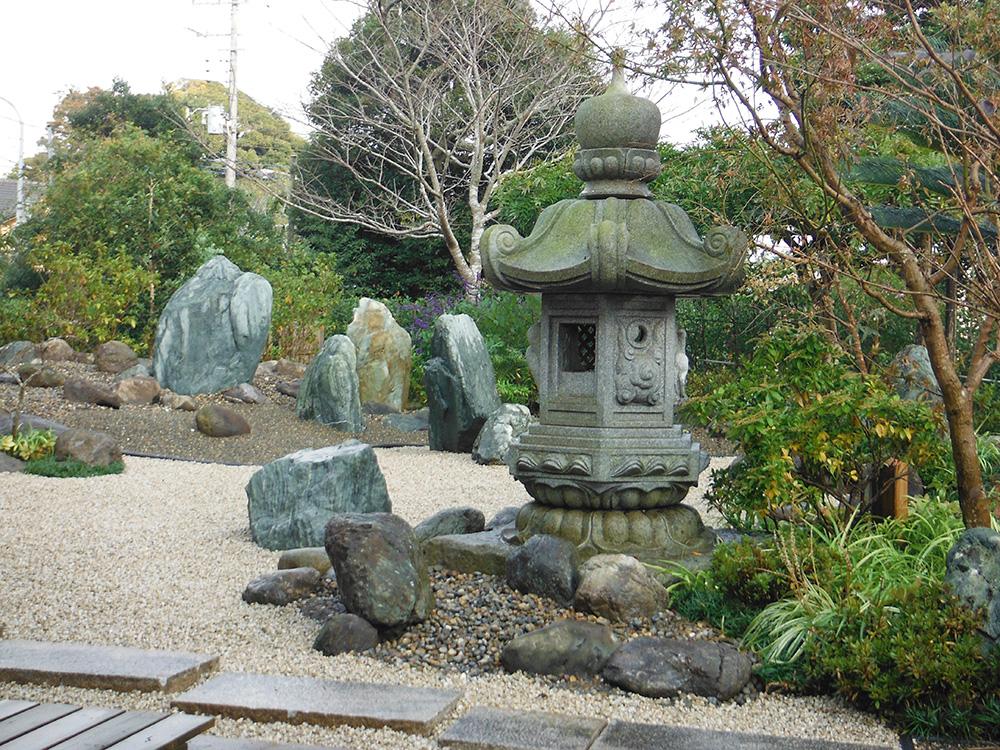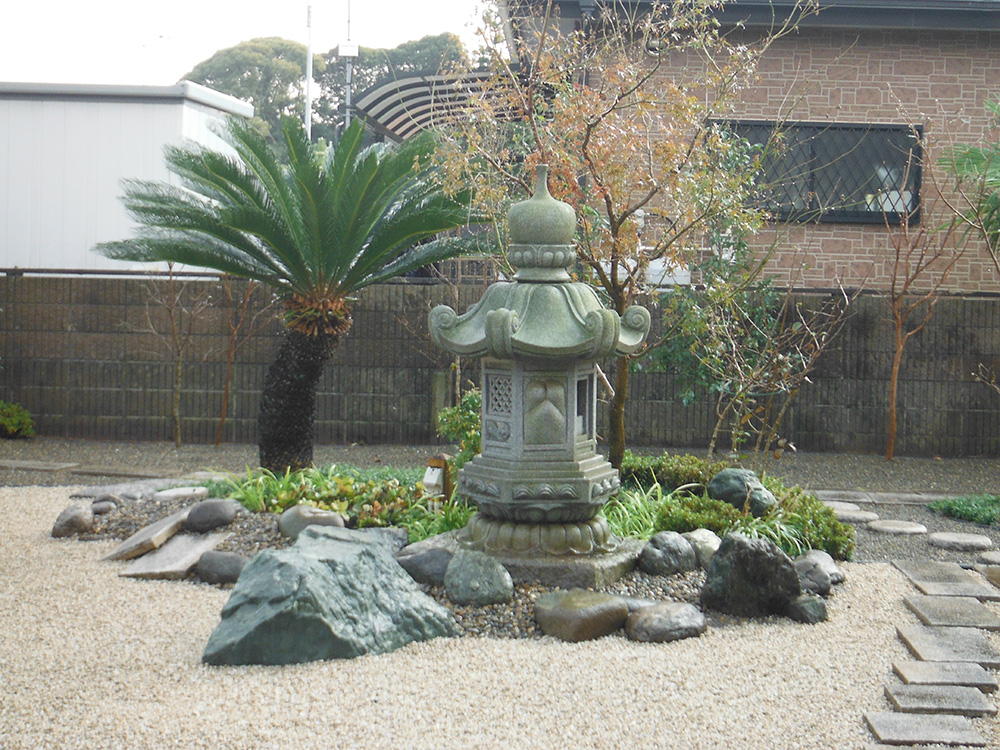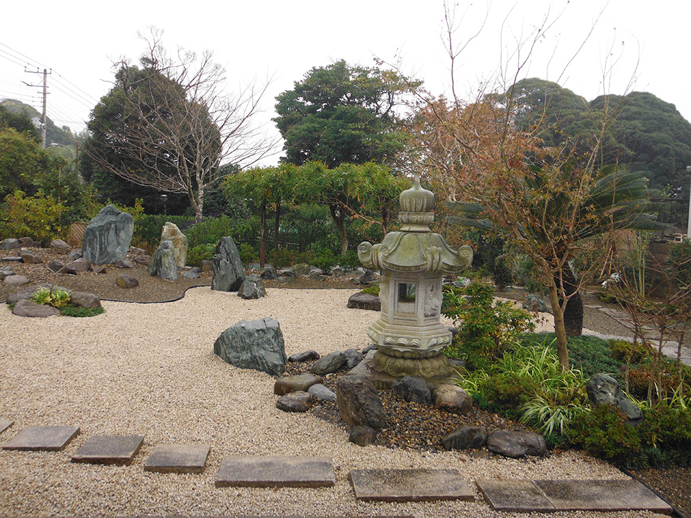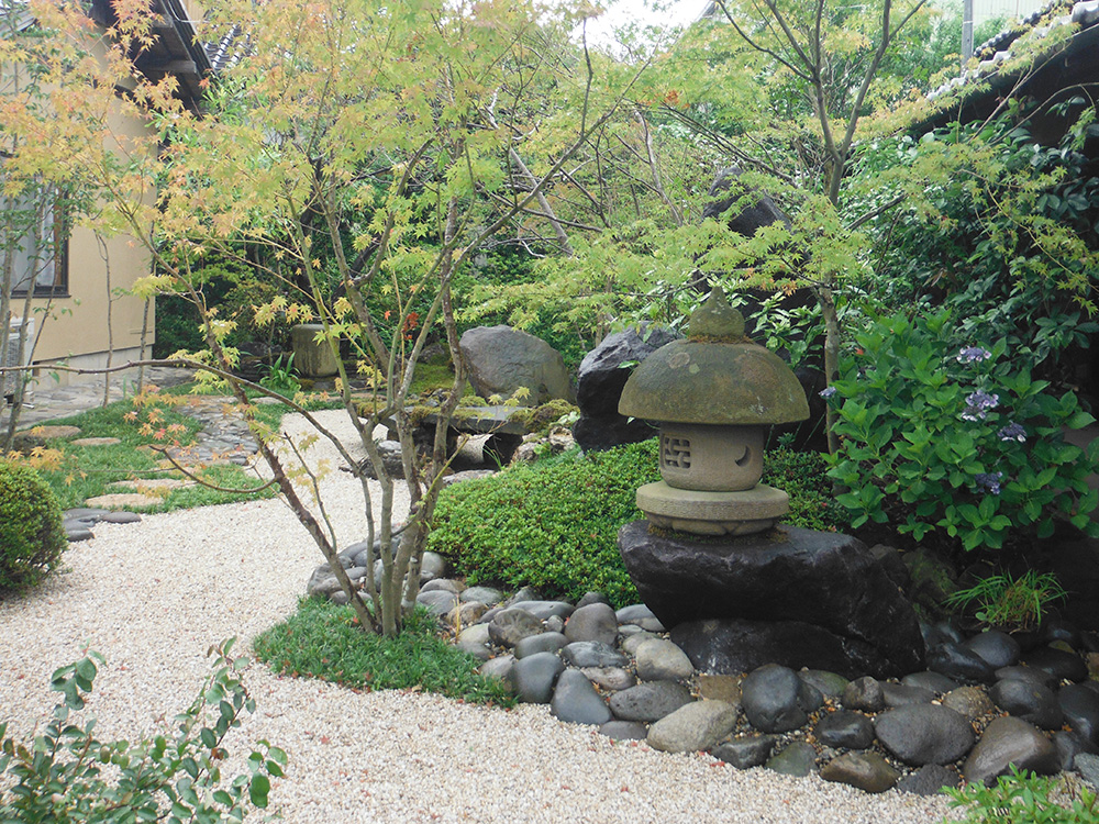 休日午後の一時。依頼様より、石庭、灯篭に対しては、高さが有る為できるだけ低く配置しました。