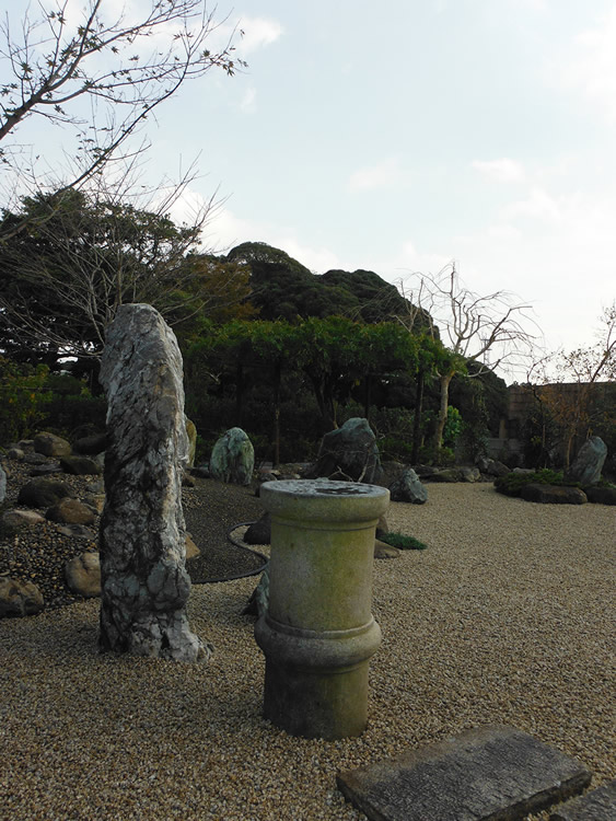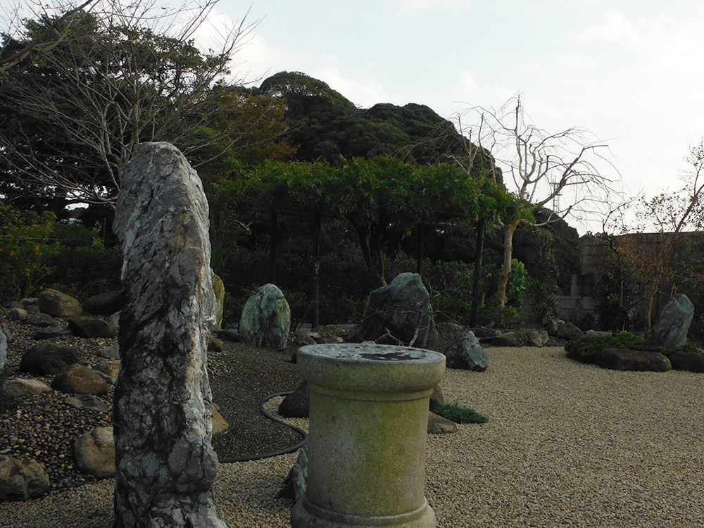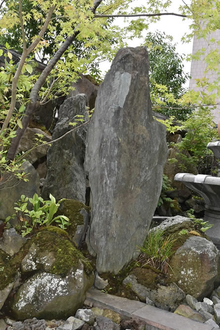 モニュメント式板石(コンクリ-ト)2枚組み合わせ、その先には、手水鉢の配置物に対して、自然に目に入る用意考えている。