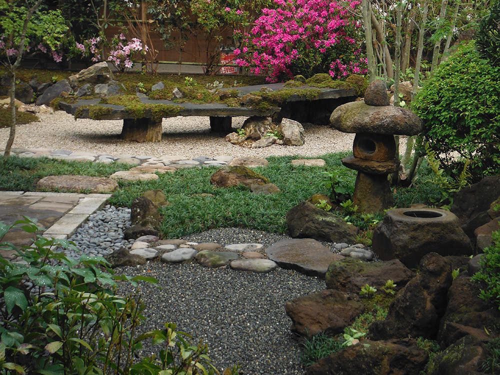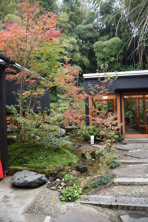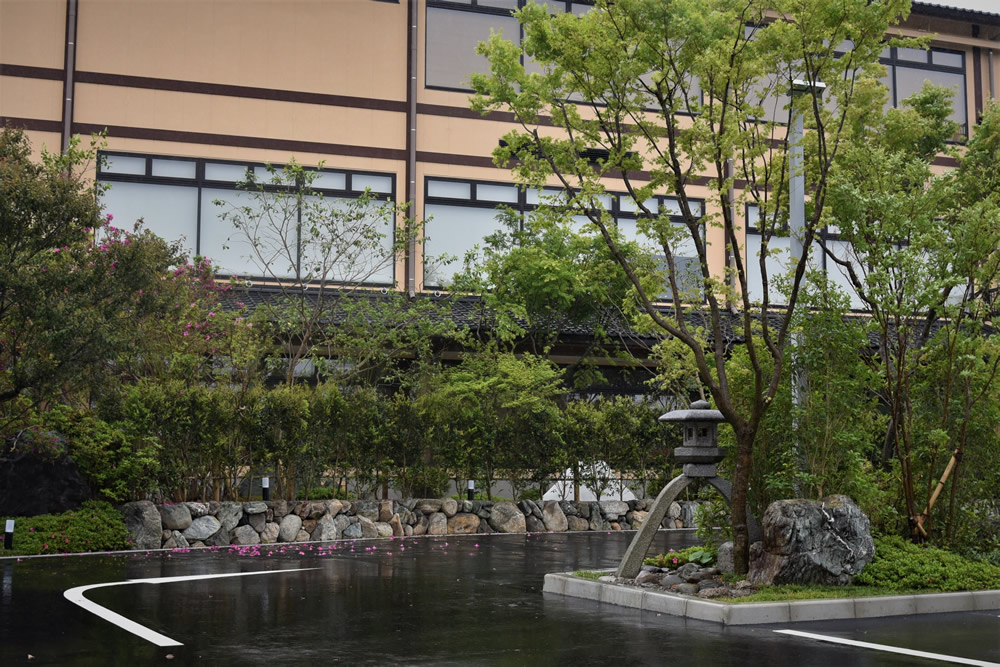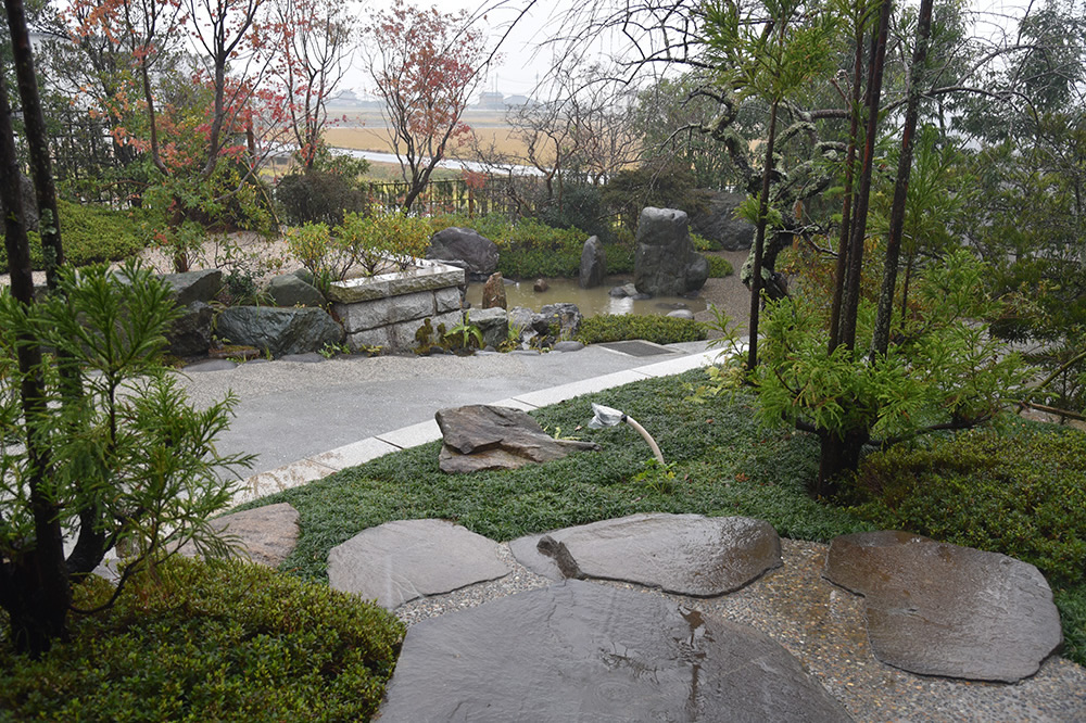 ⑦ レストラン外側には、苔、庭石、小砂利、灯篭他により日本庭園の世界をより深めています。