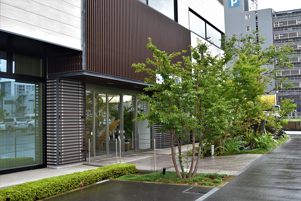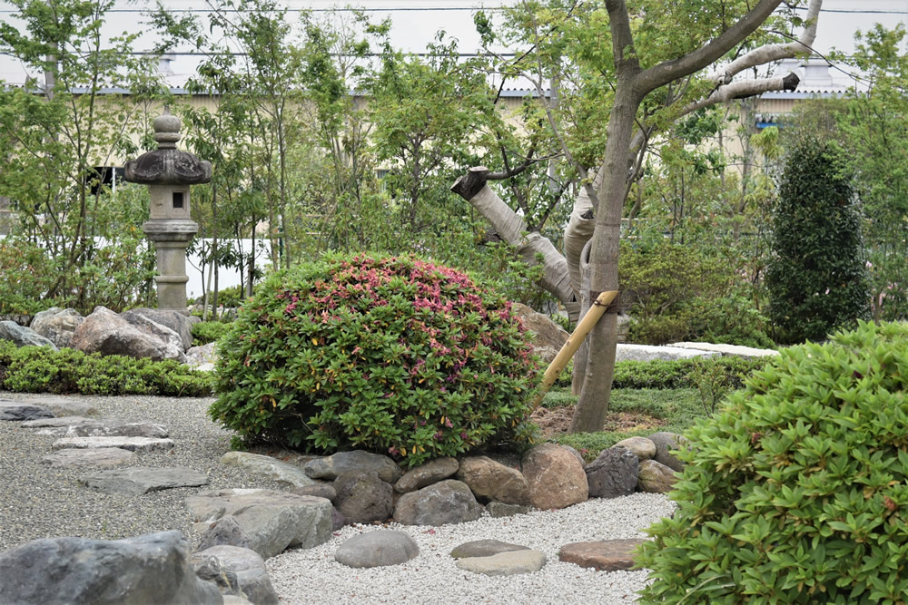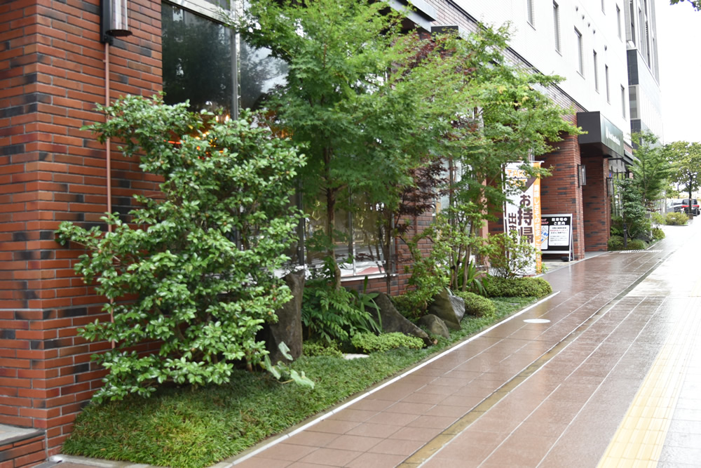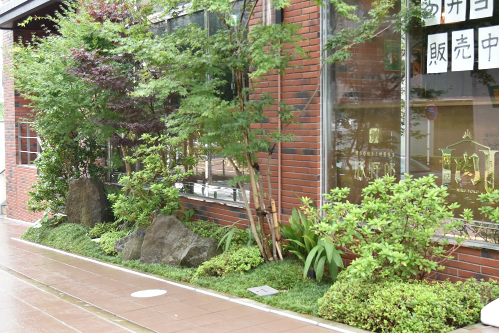 街をいきかう人々に安らぎを見られるよう花や緑を多様した庭をつくりました。