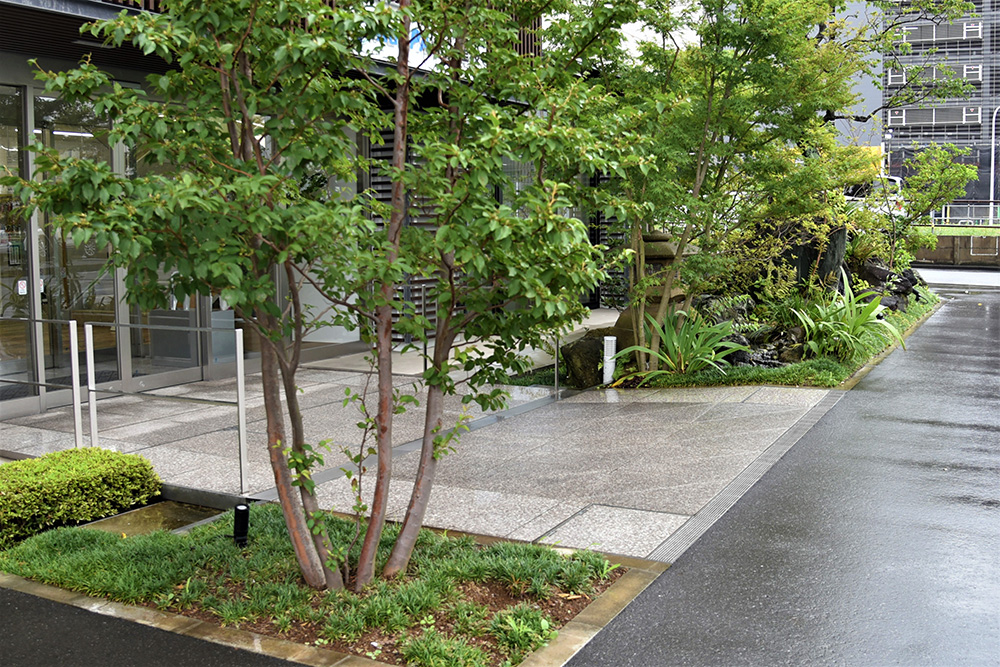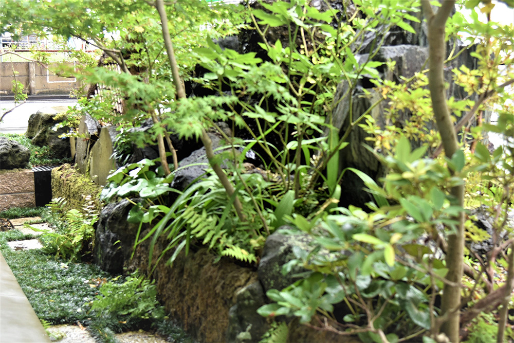 会社からのご要望は、建築物から60cm前後で雨のかからない場所、緑深く作庭したいととの要望。