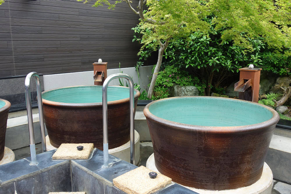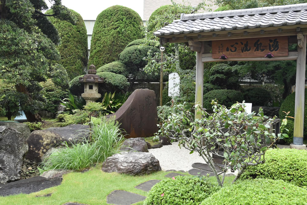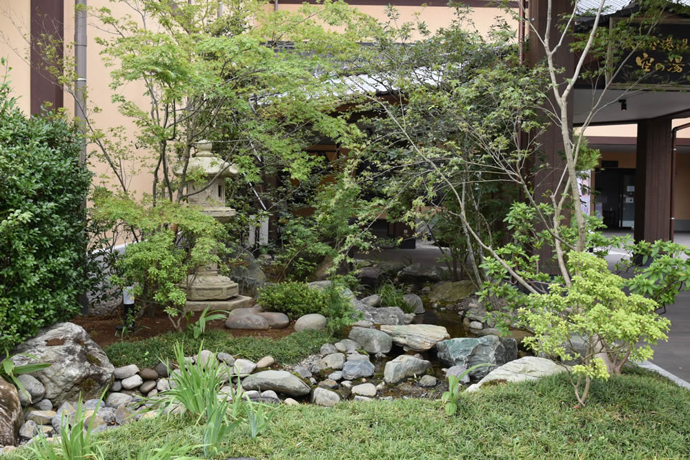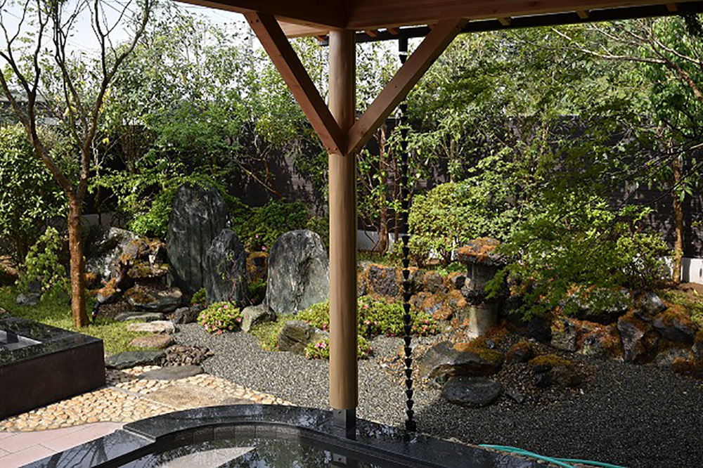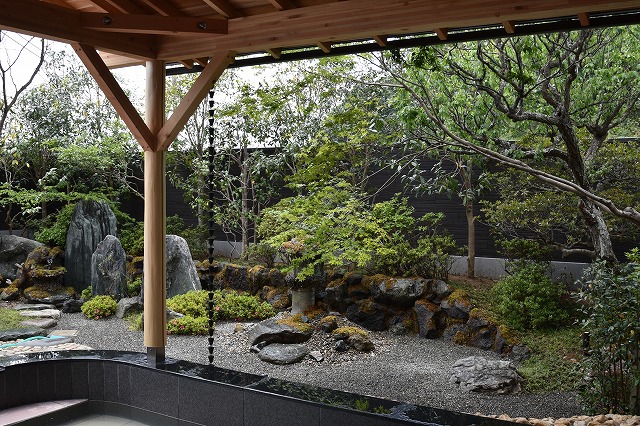 自然の山深い天然露天風呂に思えるように作庭にしました。庭園風景に力を入れない通常の庭の姿を表した。