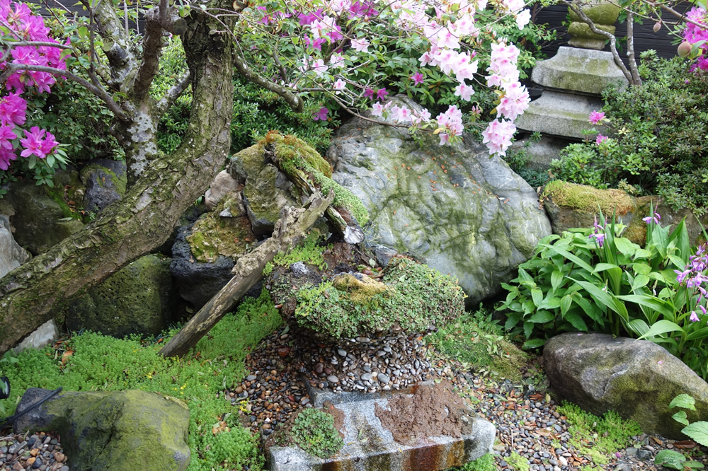 玄関前に造られている。水鉢は現状に合わせてコンクリ-トで固め小石などを組み合わせ、苔を張る事によって造られた鉢、庭の中心部を建石があるがこれにより庭に高低差を付けました。