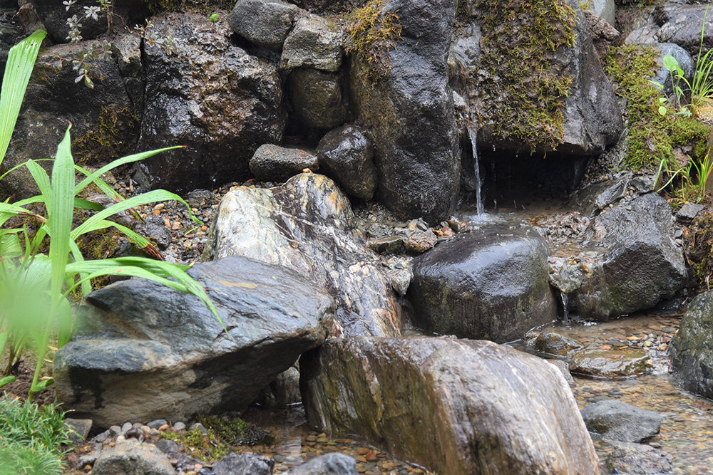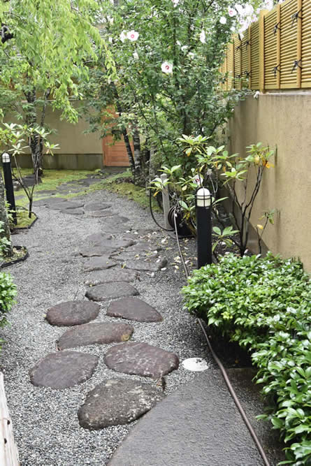 玄関前などは、石張りを通路とし、庭の入口と兼用し、滝水を左に見ながら石段を下る。