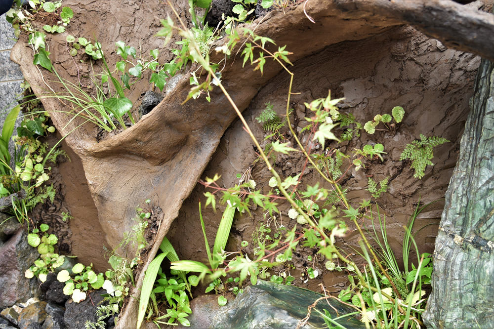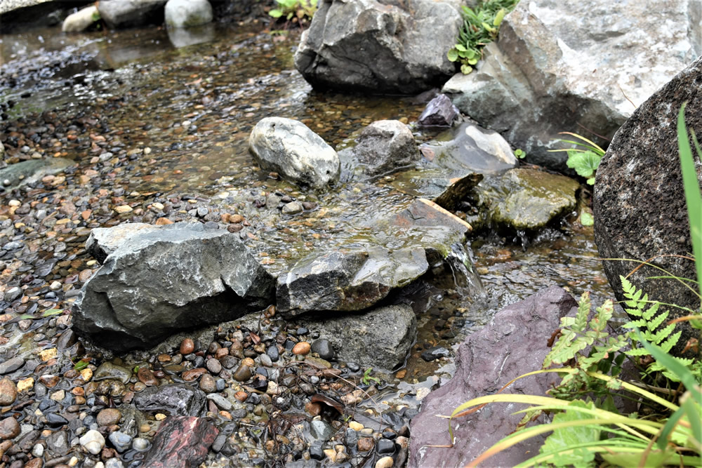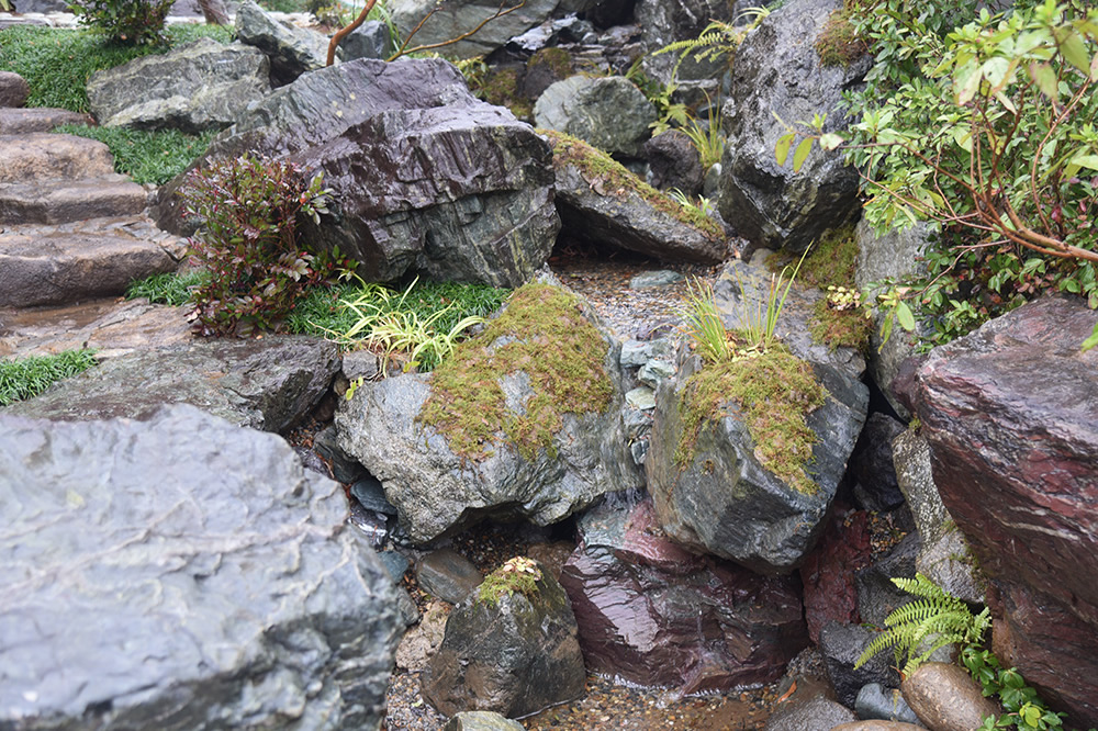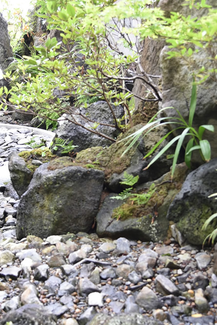 ② 道を歩いていると小さな地下に落ちる水の音、石組の隙間から流れである水の音、重量約3トン近い石を建て、高低差を造り出している。低木を多く使用し、小砂利、小石によって、水辺の世界を現している。