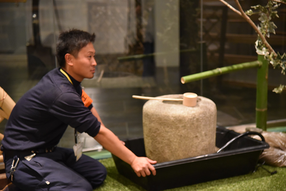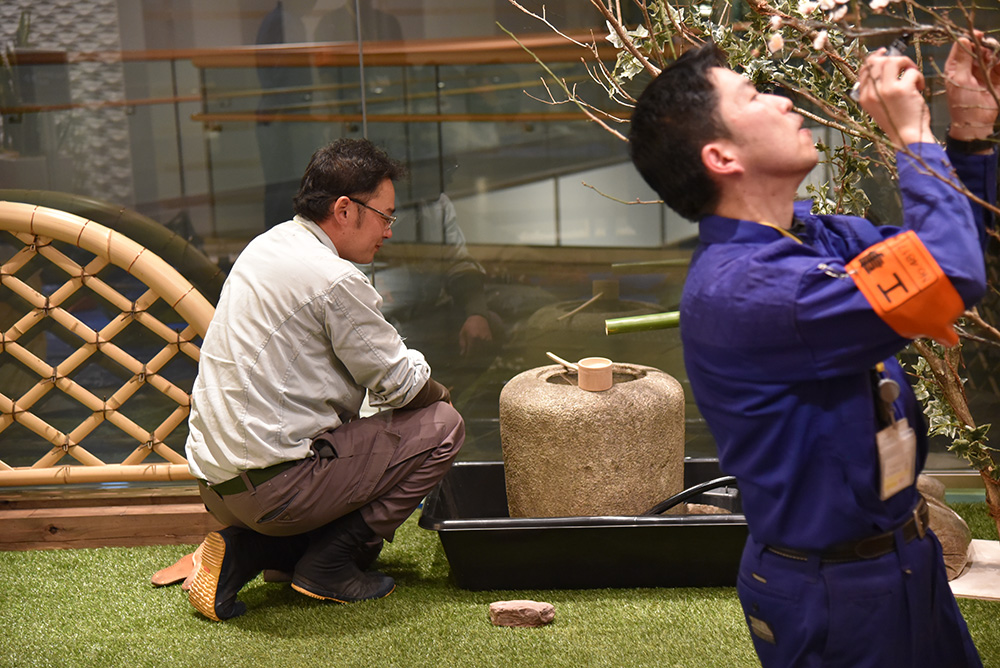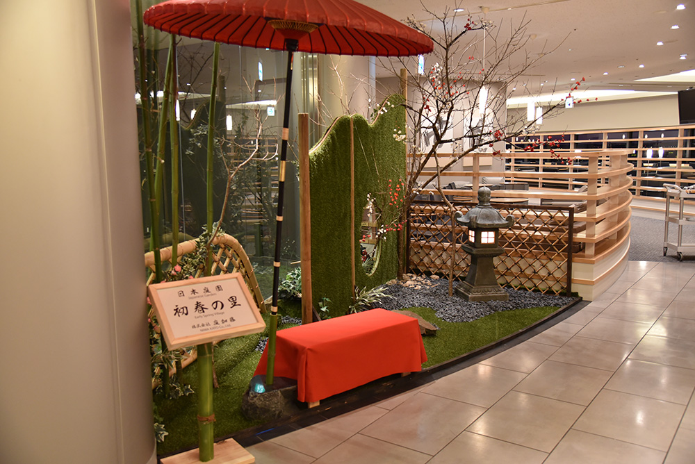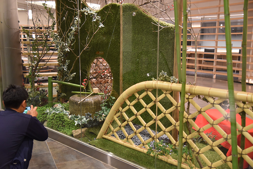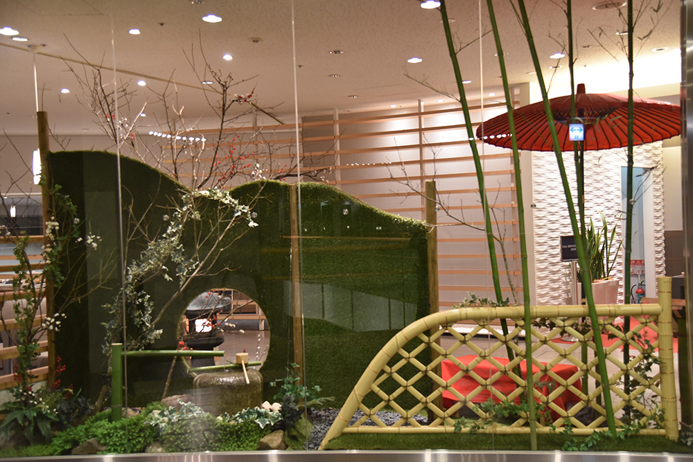 時期が12月から翌年の1月迄なので梅の花を造花し、少しでも本物に見える様に生木に枝を付け隙間に時代窓(マルマド)取り入れて手水鉢などを置きより日本庭園の姿を表現しました。