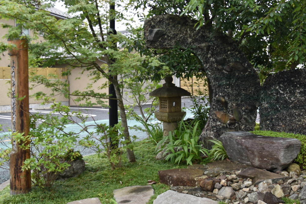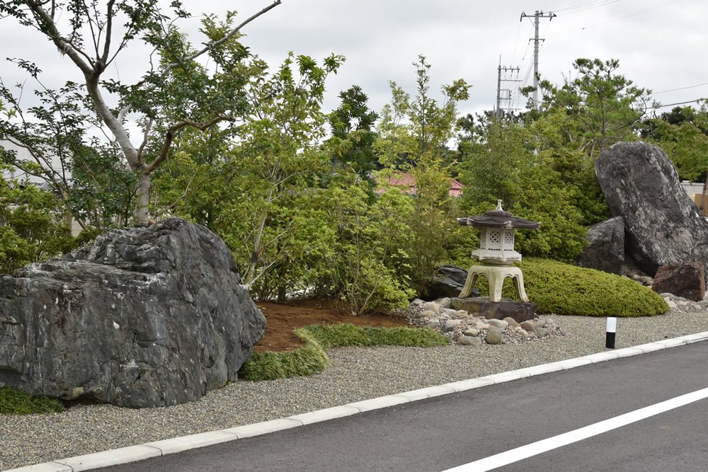 玄関左側に対して龍部は2石の紫石などによって龍の姿を見えるよう配置。背景に石を右流れに組、右側に向かって石組みにしました。植木と石組を空間に取り入れて一コマ、一コマを組み込み、灯篭などを配置し、来客者に歓迎の挨拶を踏まえて作品といたしました。