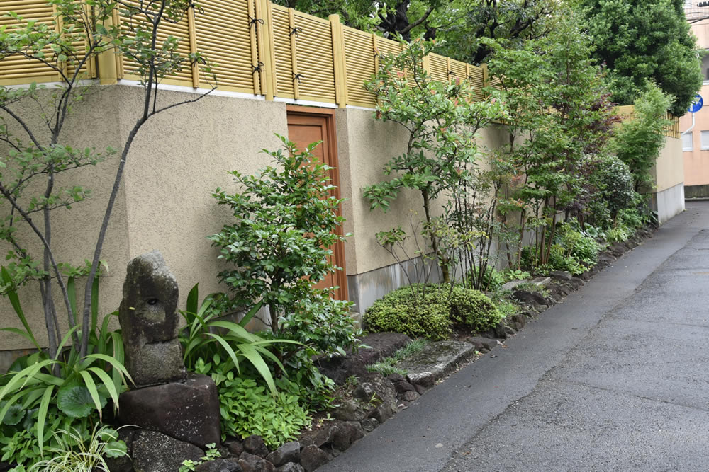 その風景を取り込んだ庭園をと、フェンスを取りはずし生垣によって道路をさえぎり、前庭の庭を弱く見えるように行い、後方の背景を取り込んだ庭です。