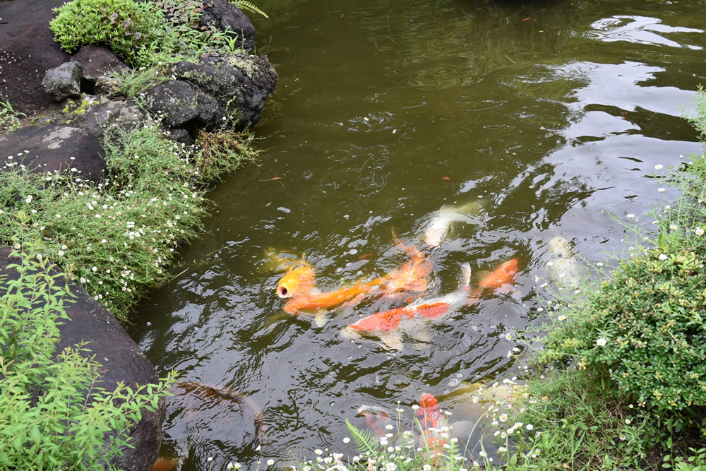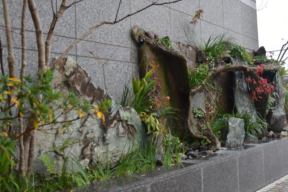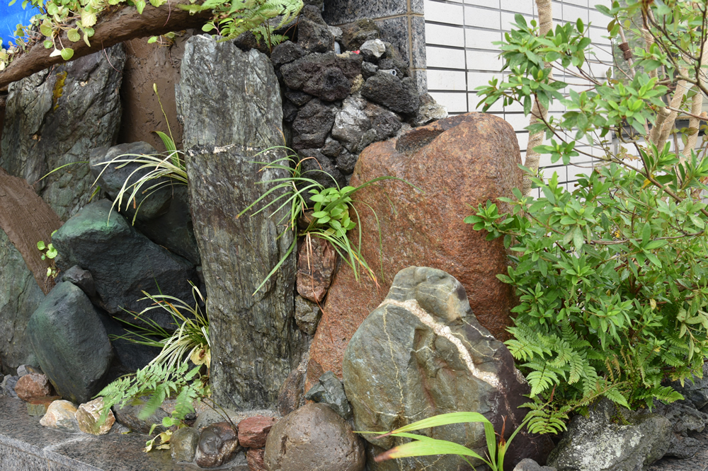滝壺の流れを形取り、自然の景観又マンホ-ル等などを利用して(楽しみ)に金魚などを数匹泳がせ見る人に一時の楽しさの一つです。