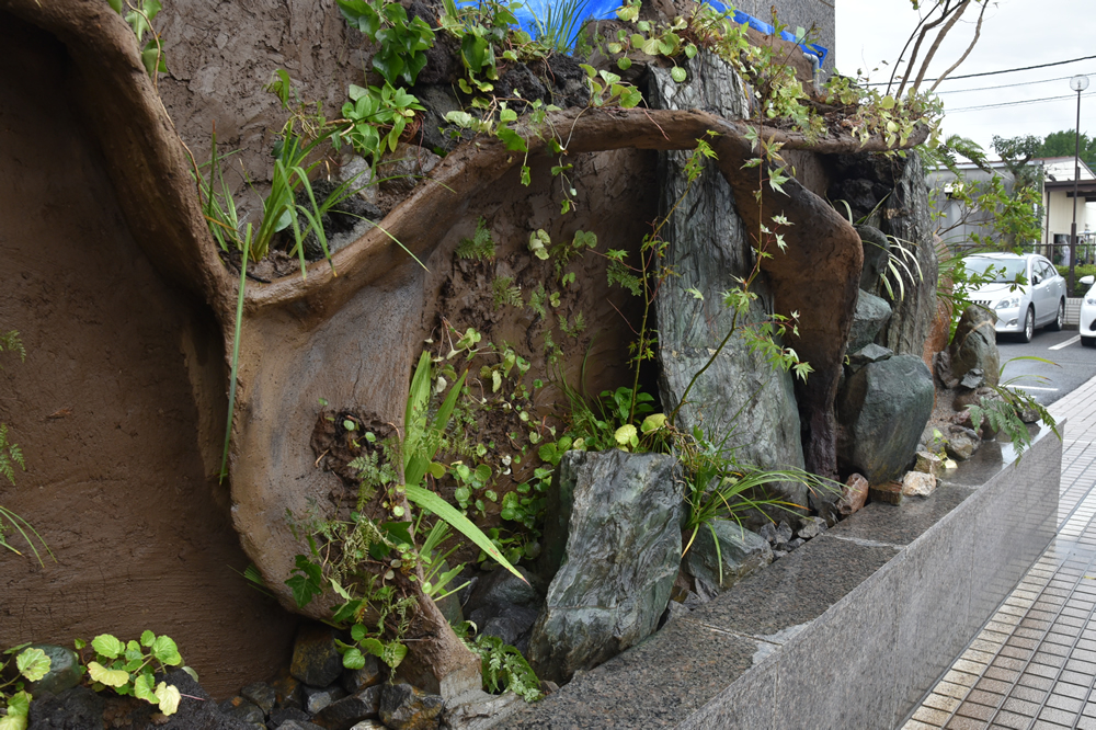 門、入口ついての壁面に苔・シダ類などを壁に植え付け、コンクリ-トを少しでも、緑深い姿を取り入れたと考えています。